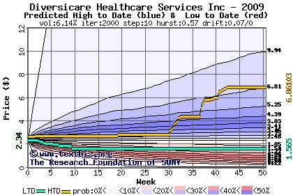 The high to date and low to date prices of the stock plotted against a random walk model for 2009 (what's this?).