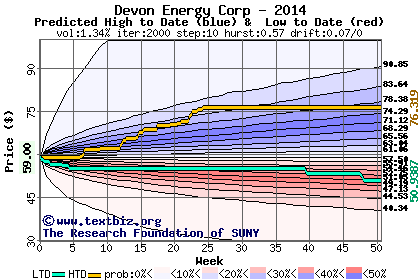 The high to date and low to date prices of the stock plotted against a random walk model for 2014 (what's this?).