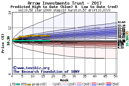 The high to date and low to date prices of the stock plotted against a random walk model for 2017 (what's this?).