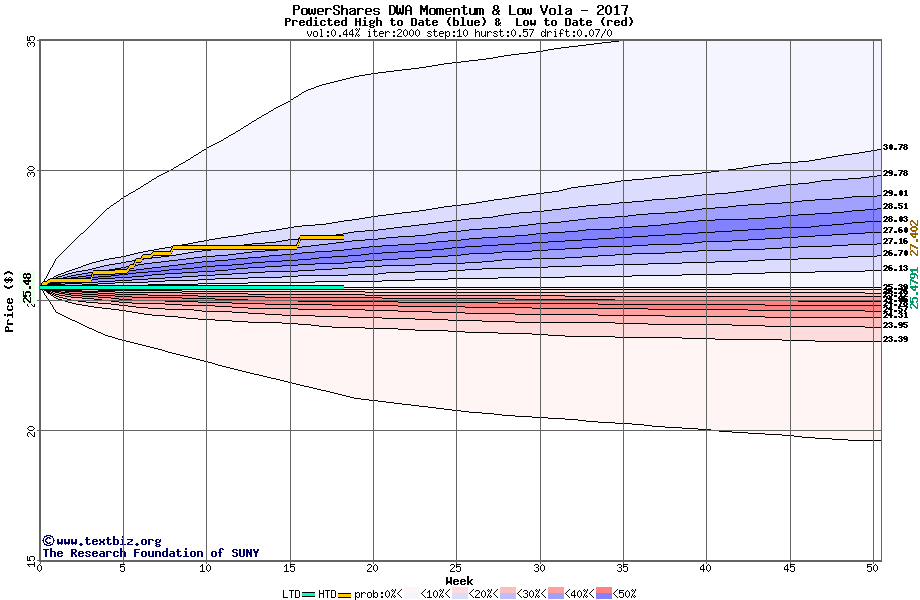 The following graph plots the year-to-date performance of the stock for 2017 compared to the probability calculated by a random walk model.