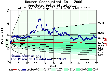 The high to date and low to date prices of the stock plotted against a random walk model for 2006 (what's this?).