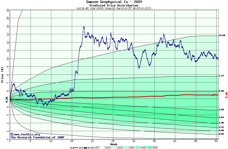 The following graph plots the year-to-date performance of the stock for 2009 compared to the probability calculated by a random walk model.