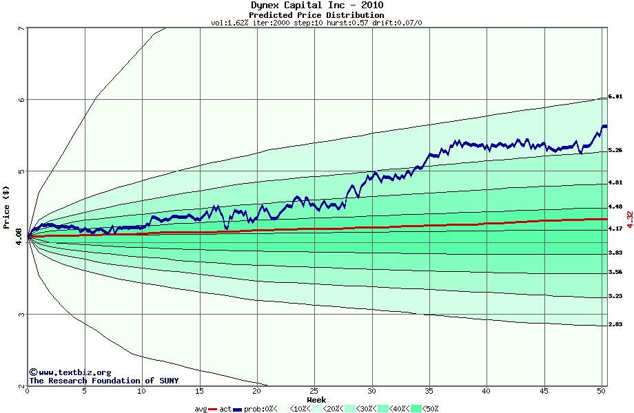 The following graph plots the year-to-date performance of the stock for 2010 compared to the probability calculated by a random walk model.