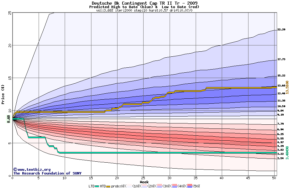 The high to date and low to date prices of the stock plotted against a random walk model for 2009 (what's this?).