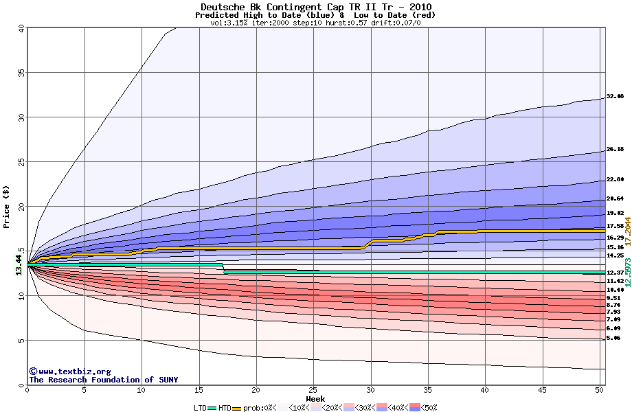 The high to date and low to date prices of the stock plotted against a random walk model for 2010 (what's this?).