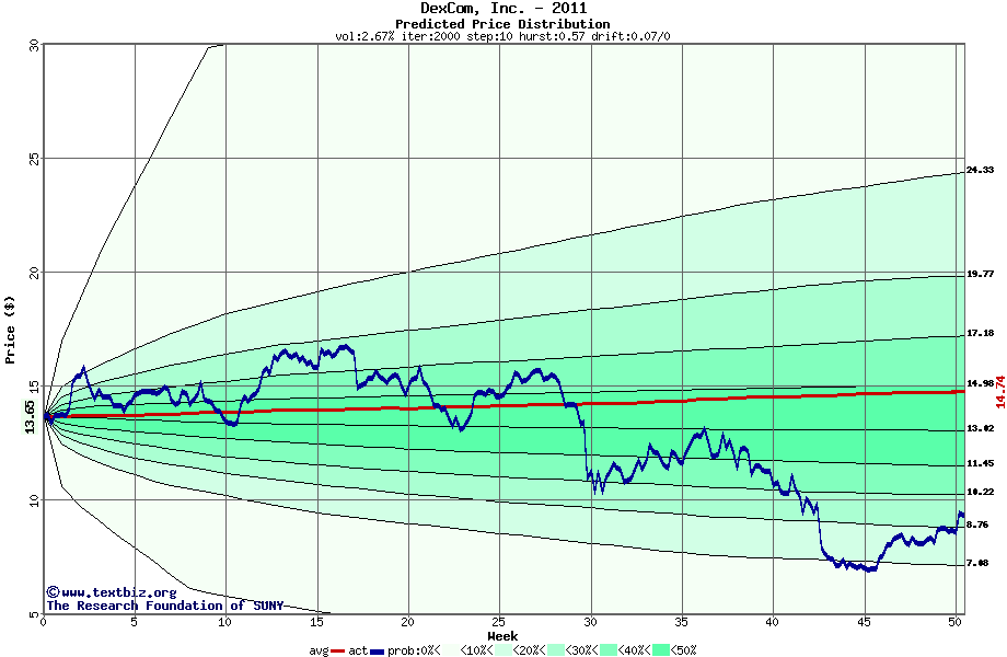 The high to date and low to date prices of the stock plotted against a random walk model for 2011 (what's this?).