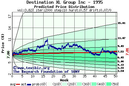 The high to date and low to date prices of the stock plotted against a random walk model for 1995 (what's this?).