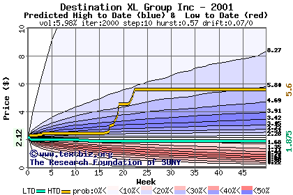 The high to date and low to date prices of the stock plotted against a random walk model for 2001 (what's this?).
