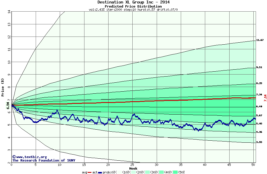 The following graph plots the year-to-date performance of the stock for 2014 compared to the probability calculated by a random walk model.