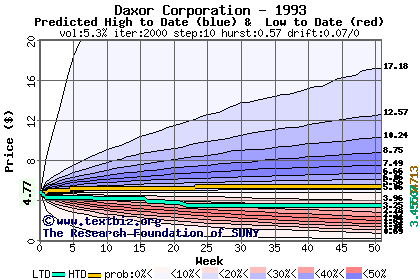 The high to date and low to date prices of the stock plotted against a random walk model for 1993 (what's this?).