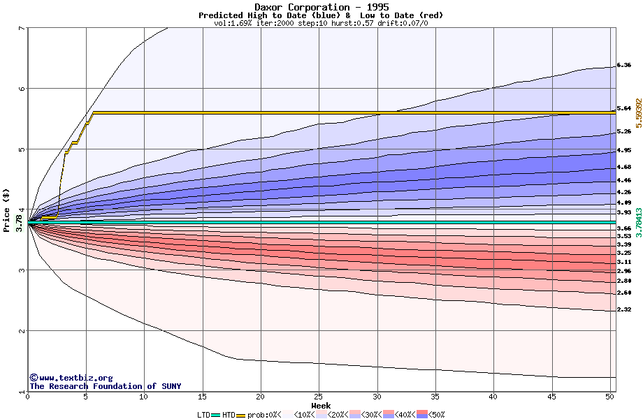 The high to date and low to date prices of the stock plotted against a random walk model for 1995 (what's this?).