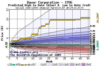 The high to date and low to date prices of the stock plotted against a random walk model for 1996 (what's this?).