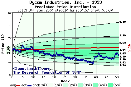 The high to date and low to date prices of the stock plotted against a random walk model for 1993 (what's this?).