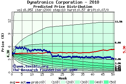 The high to date and low to date prices of the stock plotted against a random walk model for 2010 (what's this?).