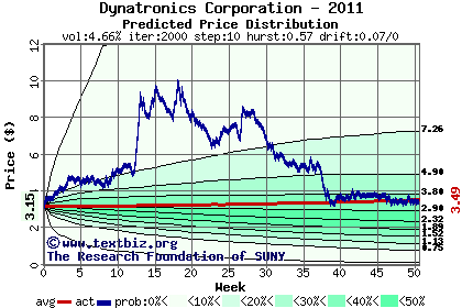 The high to date and low to date prices of the stock plotted against a random walk model for 2011 (what's this?).