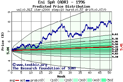 The following graph plots the year-to-date performance of the stock for 1996 compared to the probability calculated by a random walk model.