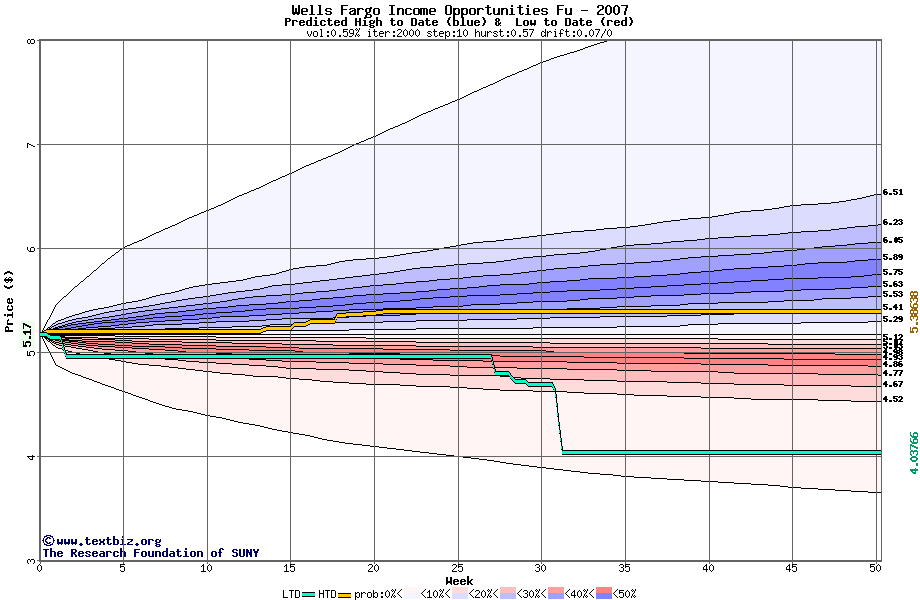 The high to date and low to date prices of the stock plotted against a random walk model for 2007 (what's this?).