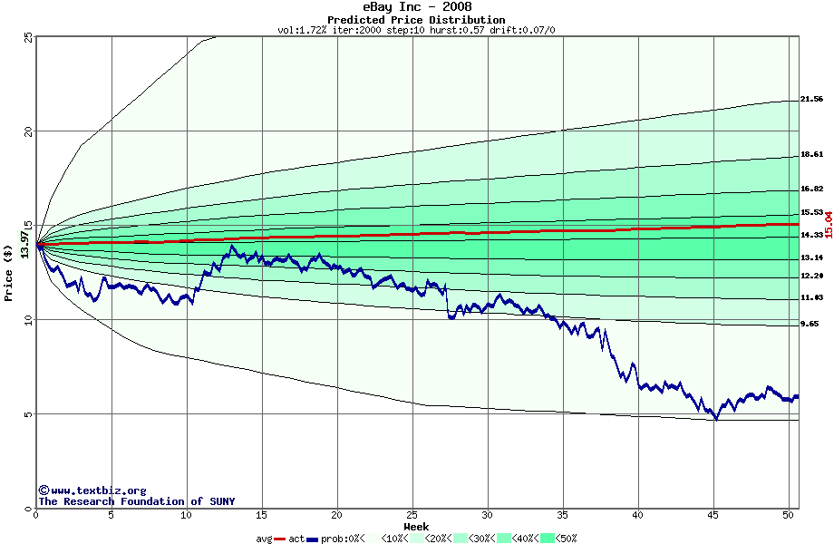 The following graph plots the year-to-date performance of the stock for 2008 compared to the probability calculated by a random walk model.