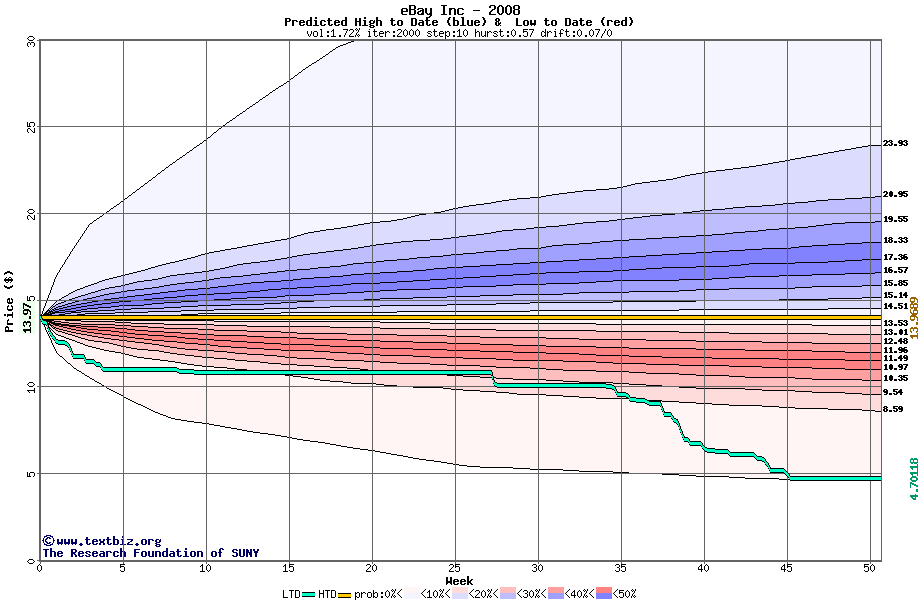 The high to date and low to date prices of the stock plotted against a random walk model for 2008 (what's this?).