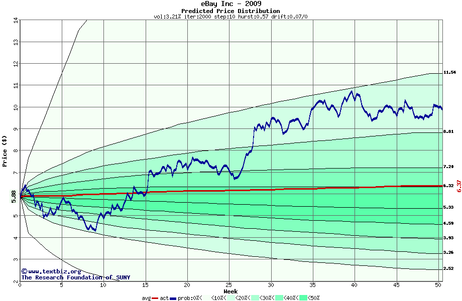 The following graph plots the year-to-date performance of the stock for 2009 compared to the probability calculated by a random walk model.