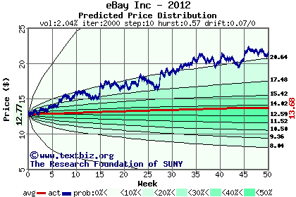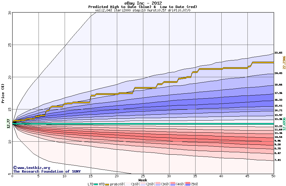 The following graph plots the year-to-date performance of the stock for 2012 compared to the probability calculated by a random walk model.