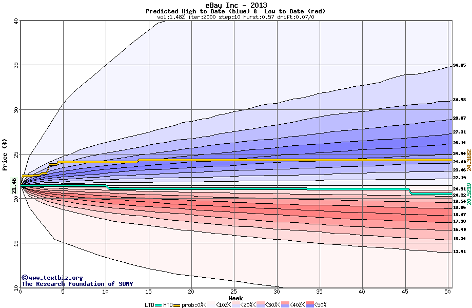 The high to date and low to date prices of the stock plotted against a random walk model for 2013 (what's this?).
