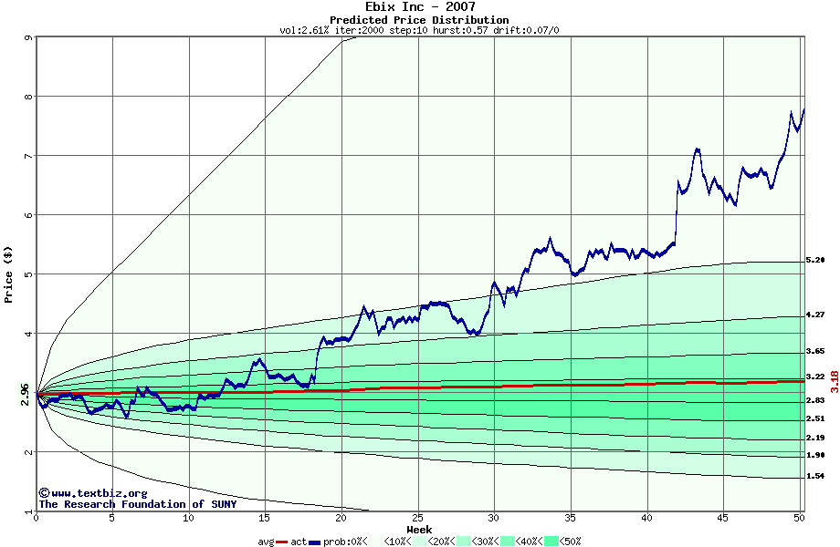 The following graph plots the year-to-date performance of the stock for 2007 compared to the probability calculated by a random walk model.
