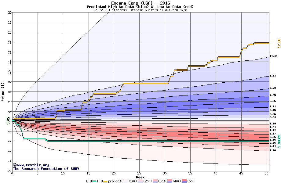 The high to date and low to date prices of the stock plotted against a random walk model for 2016 (what's this?).