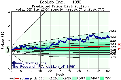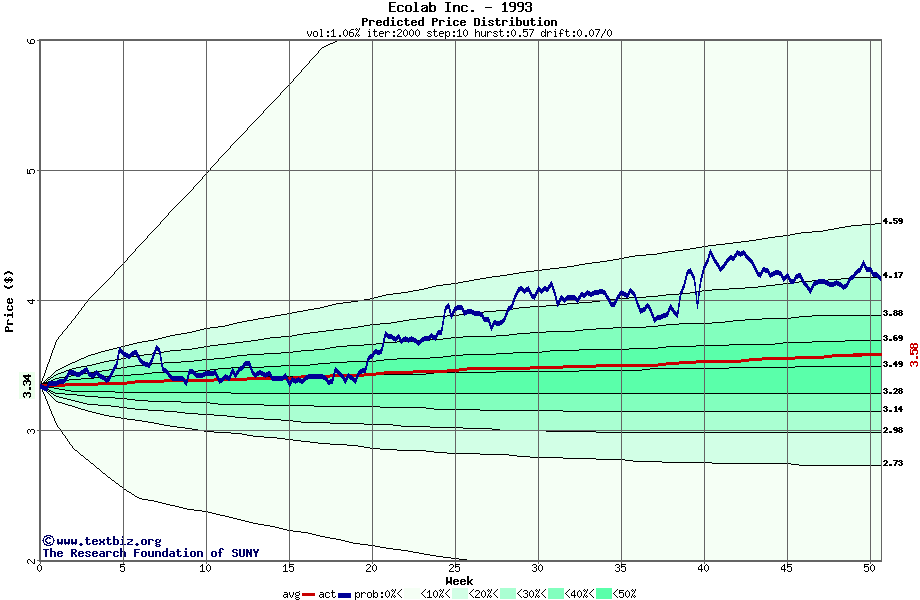 The following graph plots the year-to-date performance of the stock for 1993 compared to the probability calculated by a random walk model.