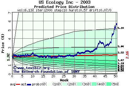 The high to date and low to date prices of the stock plotted against a random walk model for 2003 (what's this?).