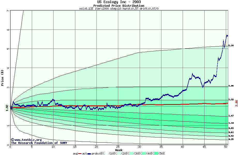 The following graph plots the year-to-date performance of the stock for 2003 compared to the probability calculated by a random walk model.