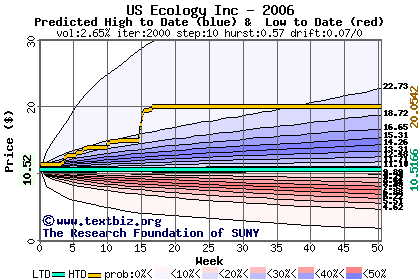The high to date and low to date prices of the stock plotted against a random walk model for 2006 (what's this?).
