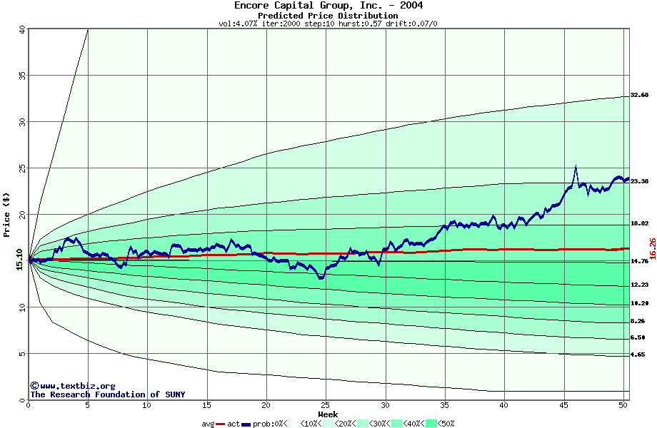 The following graph plots the year-to-date performance of the stock for 2004 compared to the probability calculated by a random walk model.