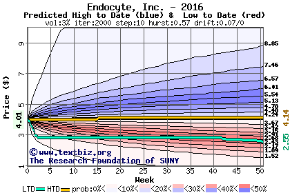 The high to date and low to date prices of the stock plotted against a random walk model for 2016 (what's this?).