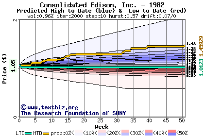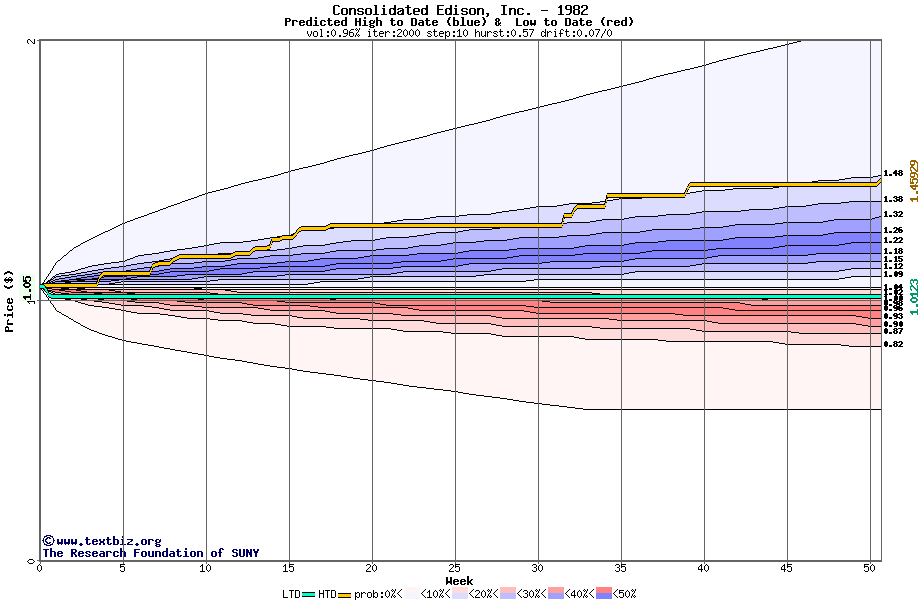 The high to date and low to date prices of the stock plotted against a random walk model for 1982 (what's this?).