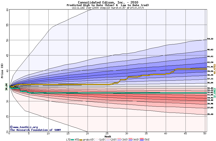 The high to date and low to date prices of the stock plotted against a random walk model for 2010 (what's this?).