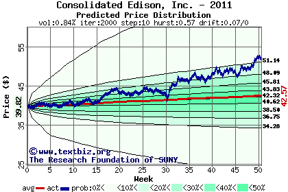 The high to date and low to date prices of the stock plotted against a random walk model for 2011 (what's this?).