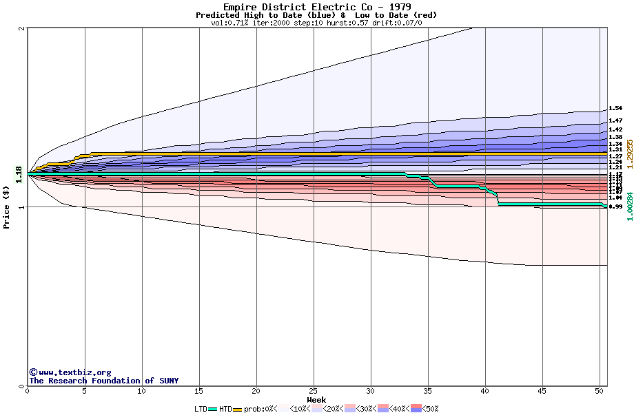 The high to date and low to date prices of the stock plotted against a random walk model for 1979 (what's this?).