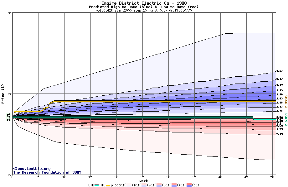 The high to date and low to date prices of the stock plotted against a random walk model for 1988 (what's this?).