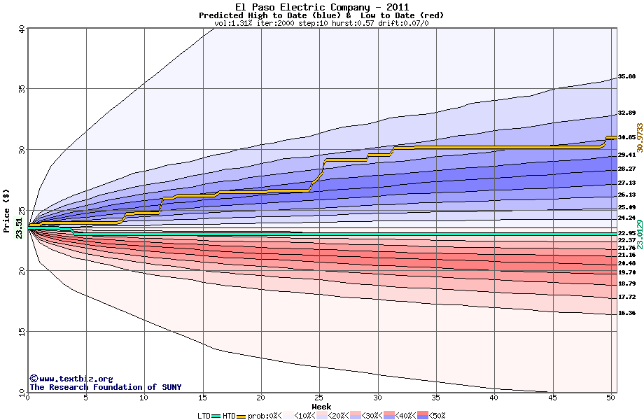 The high to date and low to date prices of the stock plotted against a random walk model for 2011 (what's this?).