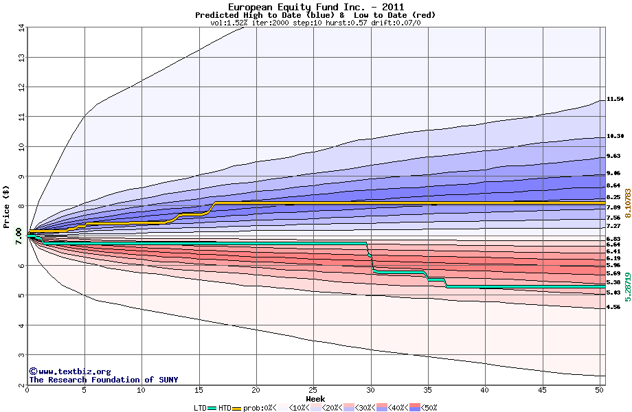The high to date and low to date prices of the stock plotted against a random walk model for 2011 (what's this?).