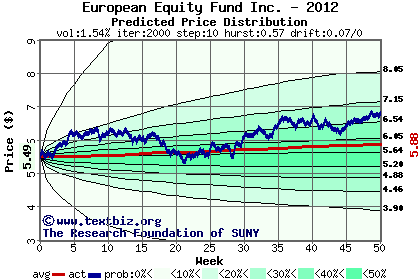 The high to date and low to date prices of the stock plotted against a random walk model for 2012 (what's this?).