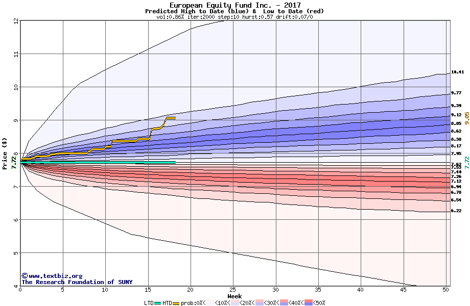 The high to date and low to date prices of the stock plotted against a random walk model for 2017 (what's this?).