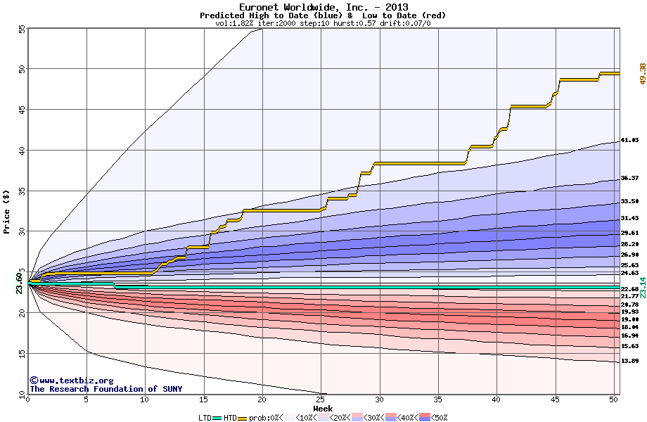 The high to date and low to date prices of the stock plotted against a random walk model for 2013 (what's this?).