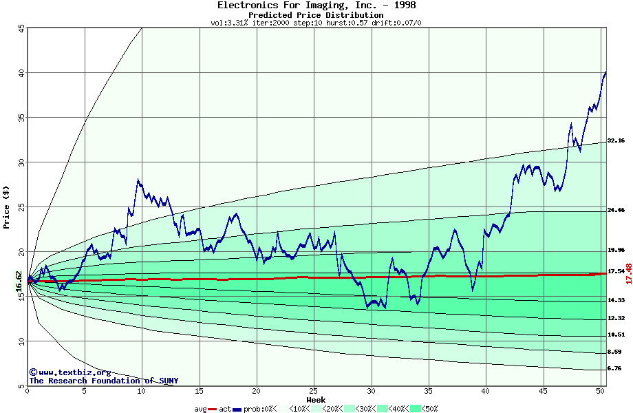 The following graph plots the year-to-date performance of the stock for 1998 compared to the probability calculated by a random walk model.
