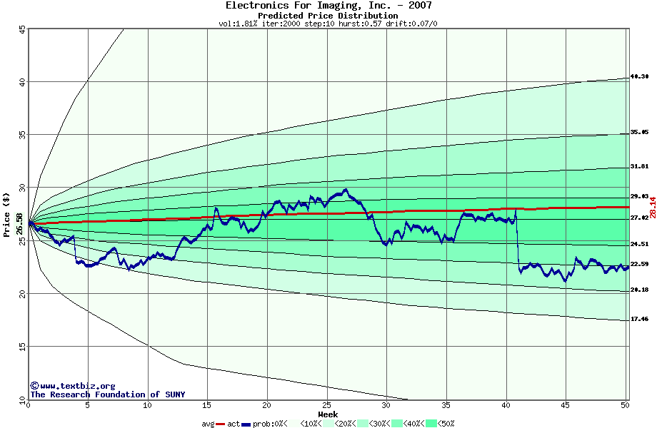 The following graph plots the year-to-date performance of the stock for 2007 compared to the probability calculated by a random walk model.
