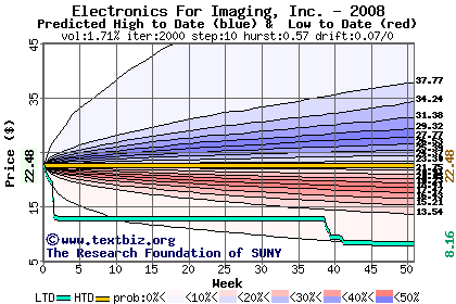 The high to date and low to date prices of the stock plotted against a random walk model for 2008 (what's this?).