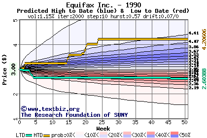 The high to date and low to date prices of the stock plotted against a random walk model for 1990 (what's this?).