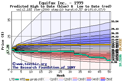 The high to date and low to date prices of the stock plotted against a random walk model for 1999 (what's this?).
