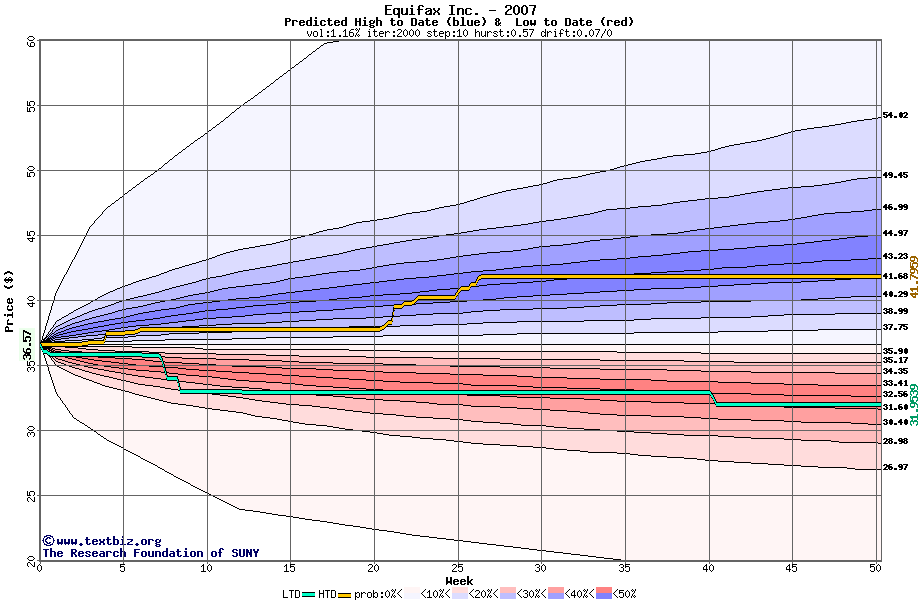 The high to date and low to date prices of the stock plotted against a random walk model for 2007 (what's this?).